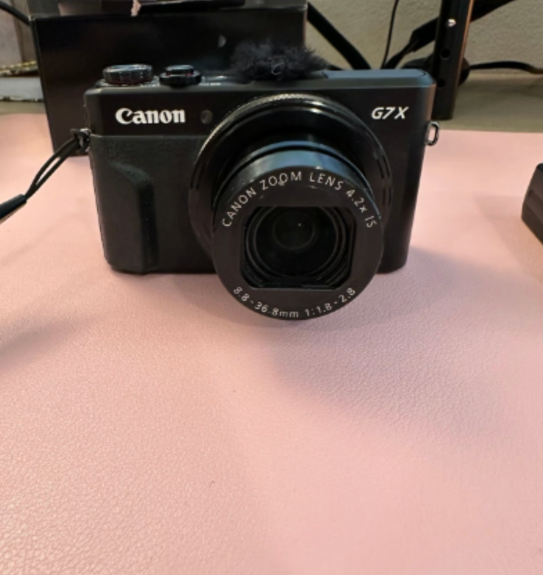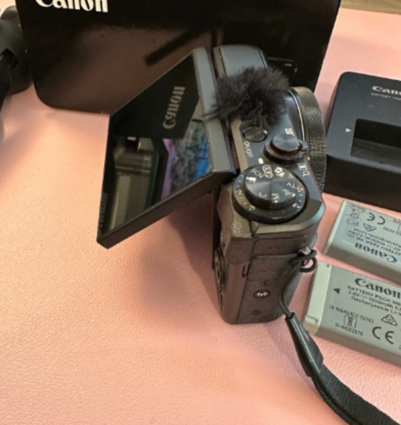 Canon g7x mark ii powershot camera. Great for vlogging and photos. Has the nice flip screen in perfect condition - always had a screen protector on it. Everything works, just normal cosmetic wear and tear. Comes with original box, two batteries, charger, wind screen fluffs and the manfrotto tripod.